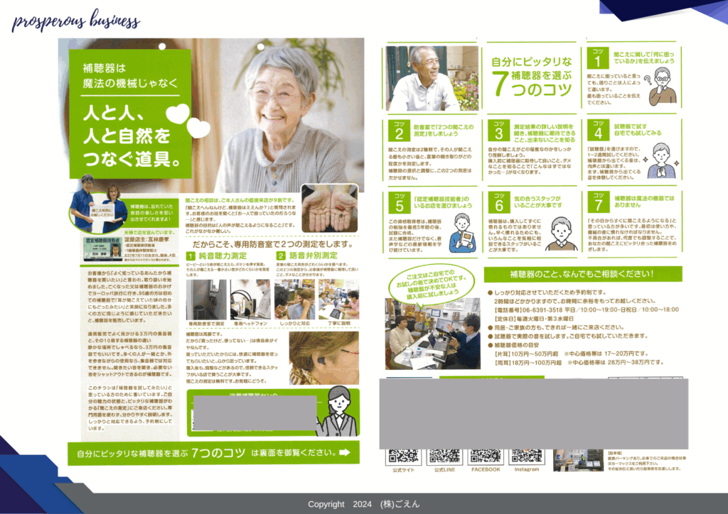そこでオーナーは、“お客様の知りたい”を伝えるチラシを作ることにしました。「補聴器を使ってみよかった」メリットをお客様にうかがい、その経験を具体的に伝える内容のチラシを撒いたのです。