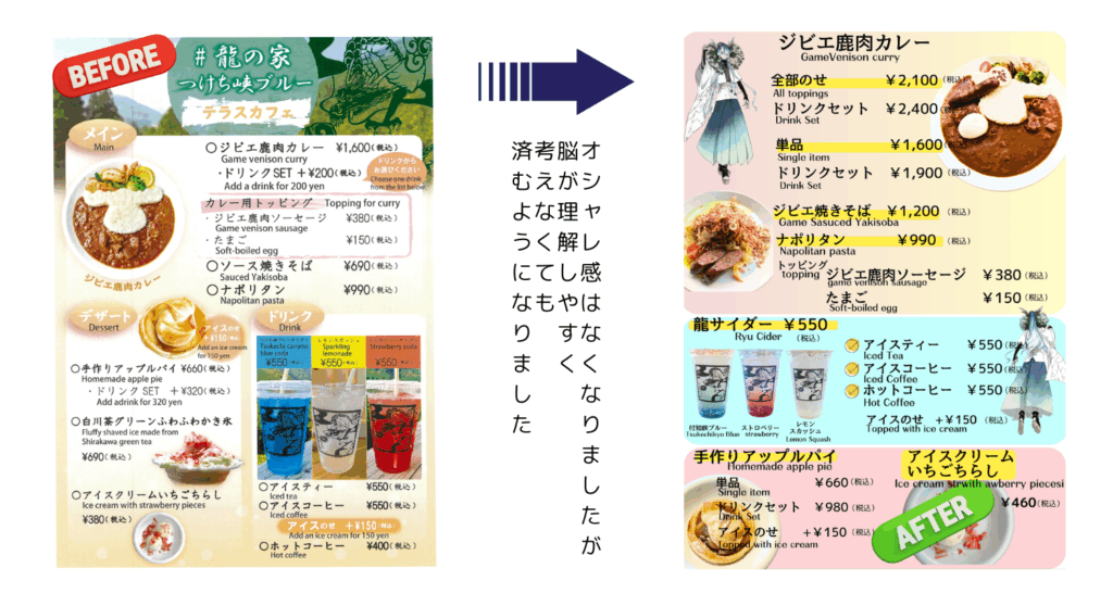 その答えはメニューの書き方です。初めからオプションを全部のせたメニュー、「全部のせ」に変更しました。つまり、従来のジビエカレー(1600円)に、初めからソーセージ(350円)とフワフワ卵(180円)をのせて、2100円としました。端数の30円を切り捨てたのは、釣銭の手間を省きたかったのと、お客様へのサービスです。これを、メニュ一表の一番上にかきました。